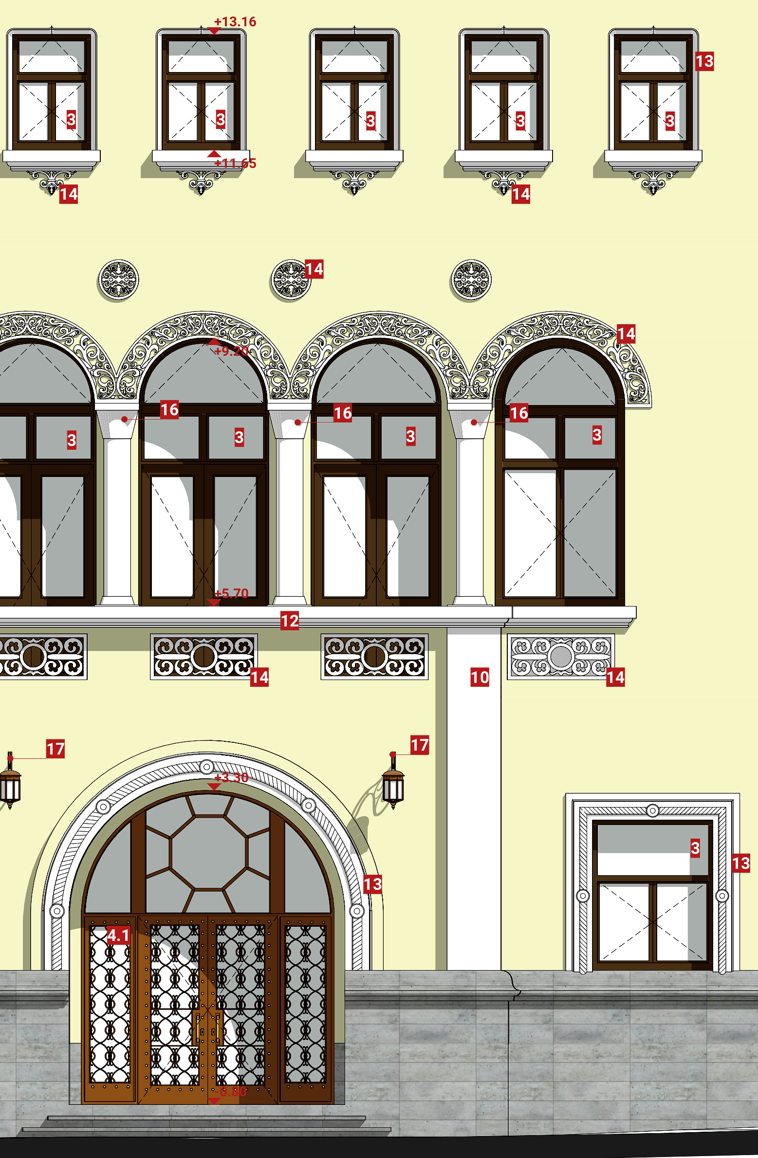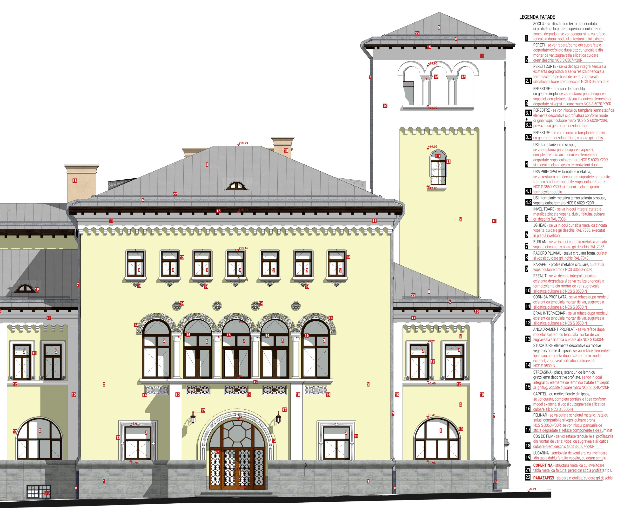 - Refacerea completă a fațadelor prin readucere la situația inițiale a clădirii, reparații/refacerea decorațiunilor, ancadramentelor, bosajelor de pe fațade
